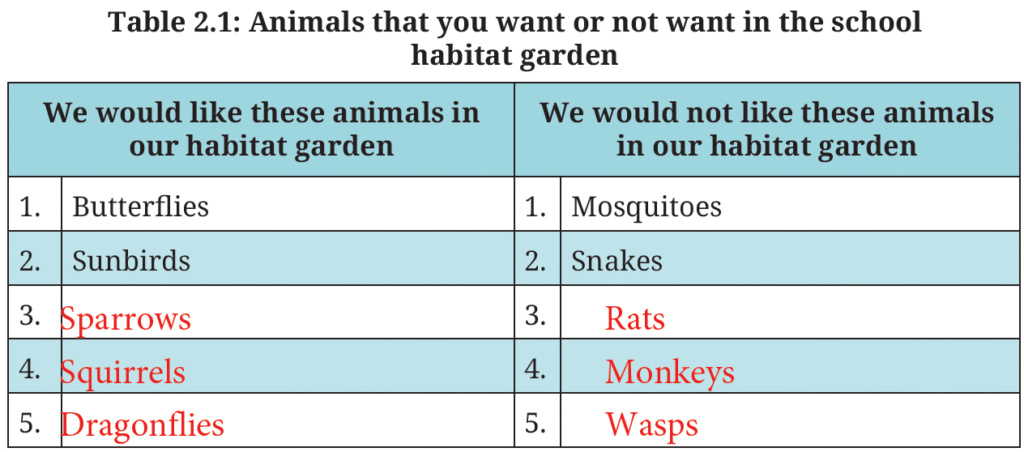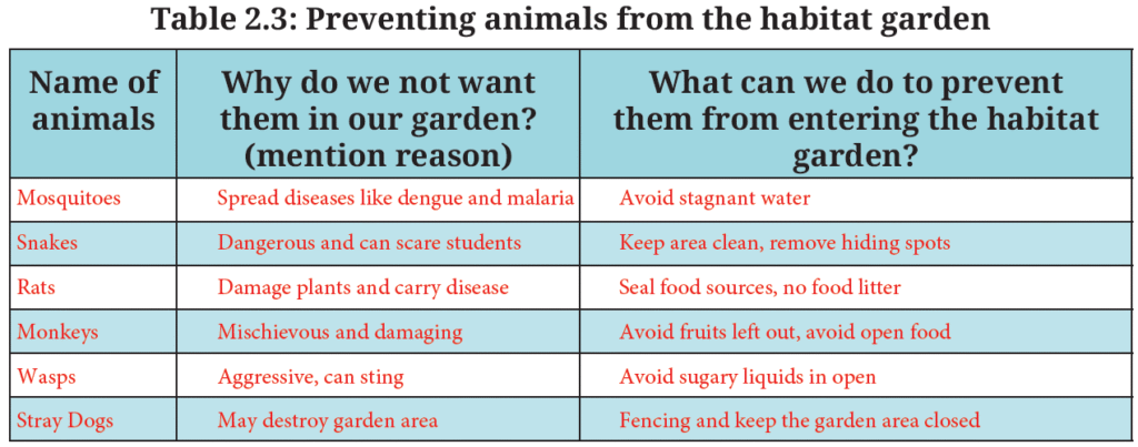 Answer: Animals like butterflies, sunbirds, sparrows, squirrels, ants, and dragonflies can be attracted to our school habitat garden if we provide food, water, shelter, and space for them. - How can we prevent the entry of animals we do not want in the school habitat garden?