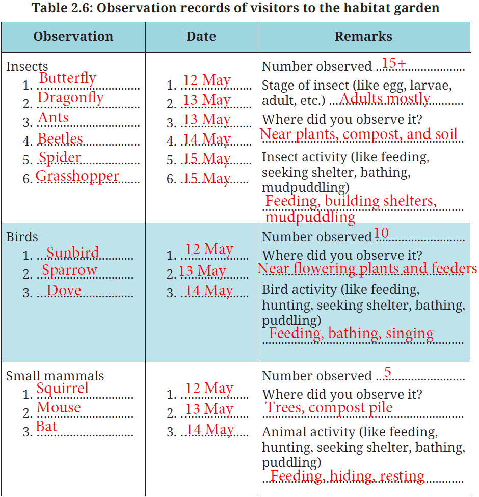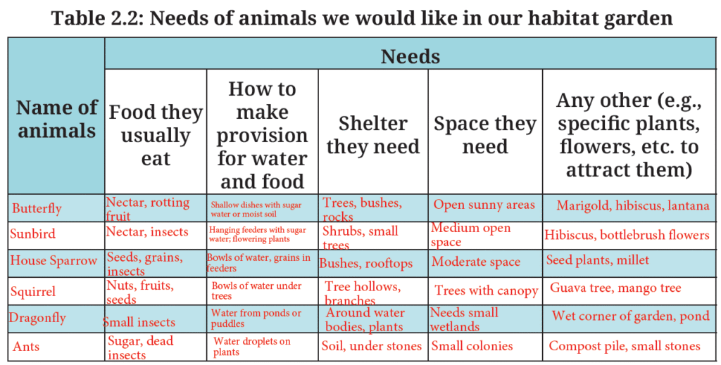 Answer: We will plant seasonal flowering plants like marigold, hibiscus, sunflower, and herbs like tulsi and mint. These attract butterflies, bees, and birds. - How will you make sure you do not disturb animals while watering and weeding your garden (e.g., a walkway of sand or brick, areas for mudpuddling in a corner of the garden)?