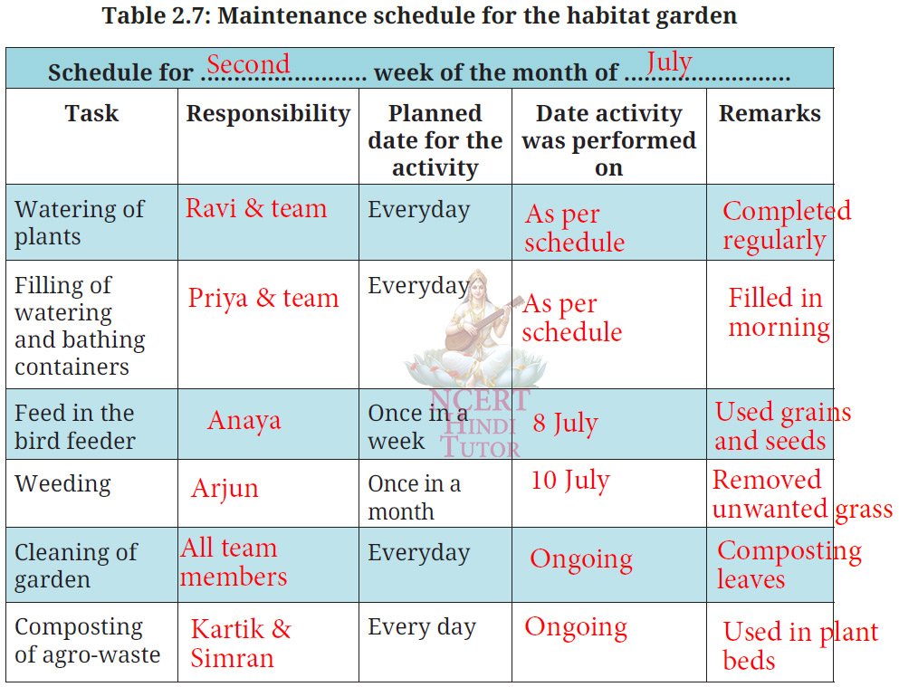 Answer: We will create a weekly schedule where each team member will take care of watering, cleaning, feeding, and checking plant health regularly. - Identify few examples of jobs related to the work you just did. For example, naturalist, conservationist, entomologist, zoologist, botanist, forest officer, environmentalist. Look around, speak to people and write your answer.